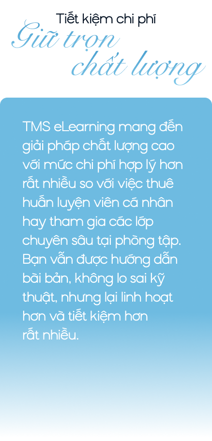 TMS eLearning thiết kế chương trình rõ ràng, tránh gây quá tải khi phải lựa chọn quá nhiều. Bạn sẽ dành nhiều thời gian hơn để tập luyện thực tế, không bị phân tâm bởi quá nhiều lựa chọn. Việc so sánh chỉ còn là bạn với chính bạn – người duy nhất cần quan tâm và phấn đấu từng ngày.